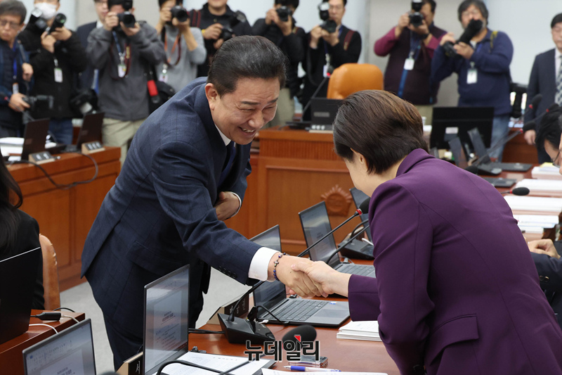 김병기 국회 운영위원장이 18일 오전 국회에서 열린 운영위원회 전체회의에서 야당 의원들과 악수를 나누고 있다.