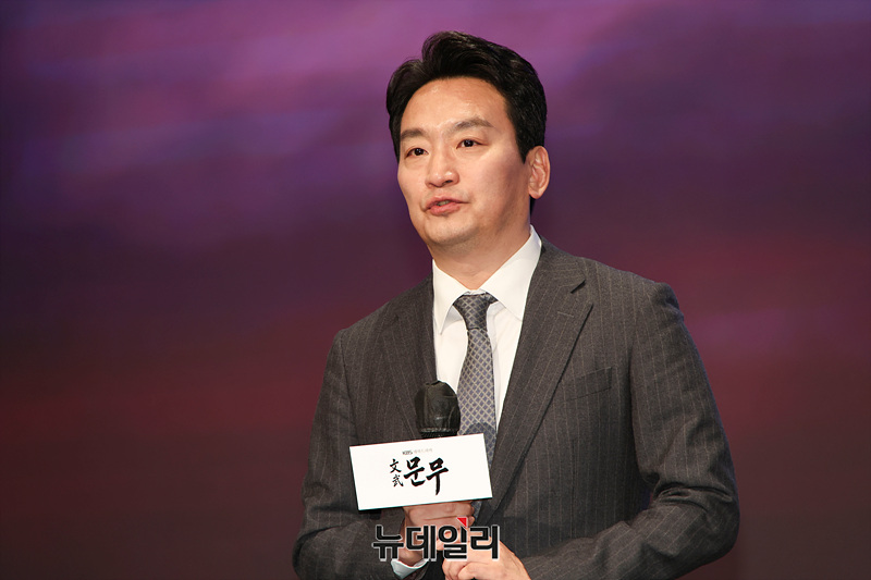 박장범 KBS 사장이 18일 오후 서울 구로구 더 세인트에서 열린 KBS 2TV 대하드라마 '문무' 제작보고회에서 인사말을 하고 있다.