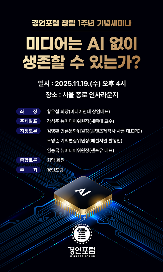 경언포럼(회장 황우섭)이 오는 19일 오후 4시, 서울 종로 인사라운지에서 '미디어는 AI 없이 생존할 수 있는가?'를 주제로 세미나를 개최한다. 이번 세미나는 인터넷 중심 시대를 넘어 생성형 AI가 일상화된 환경에서 변화하는 소통 방식과 미디어의 역할을 재조명한다.