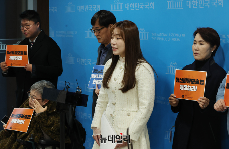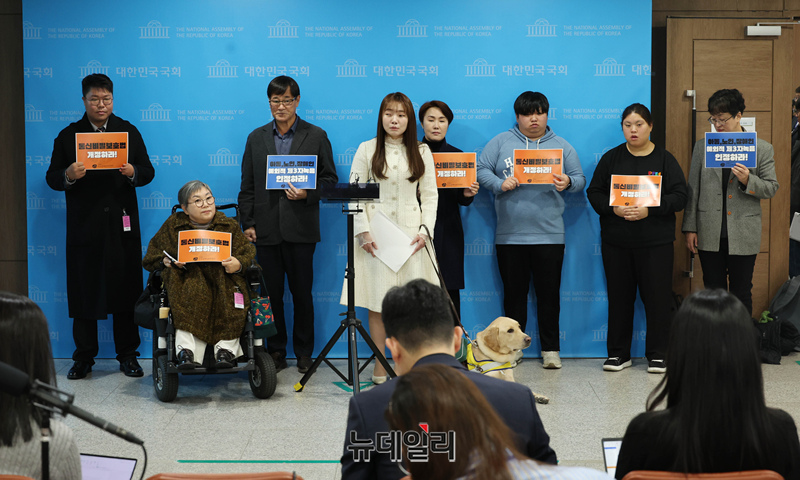 김예지 국민의힘 의원이 19일 오전 국회 소통관에서 열린 학대에 취약한 아동·노인·중증장애인을 위한 법안 발의 기자회견을 마친 후 기자들의 질문에 답하고 있다.