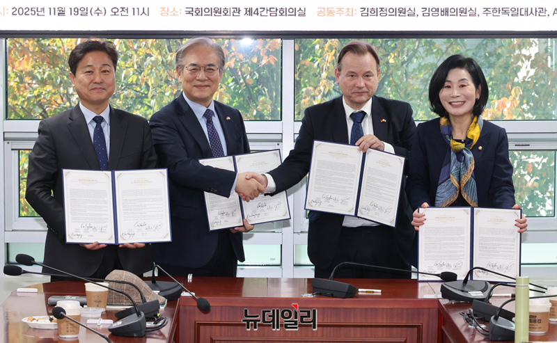 김영배 더불어민주당 의원, 김효준 (사)한국독일네트워크(ADeKo) 이사장, 게오르크 빌프리트 슈미트 주한독일대사, 김희정 국민의힘 의원(왼쪽부터)이 19일 오전 국회 의원회관에서 열린 '한국-독일 학생 교환방문 프로그램 MOU 체결식'에서 기념촬영을 하고 있다.