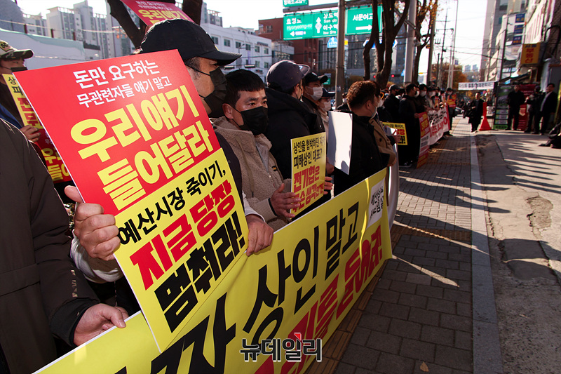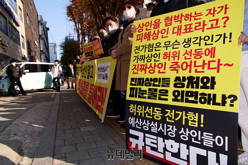 [포토] 전국가맹점협의회 규탄하는 예산상설시장 상인들