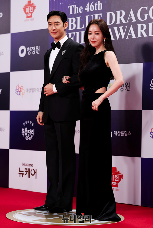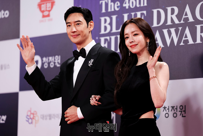 배우 이제훈과 한지민이 19일 오후 서울 여의도 KBS홀에서 열린 제46회 청룡영화상 시상식 레드카펫에서 포즈를 취하고 있다.