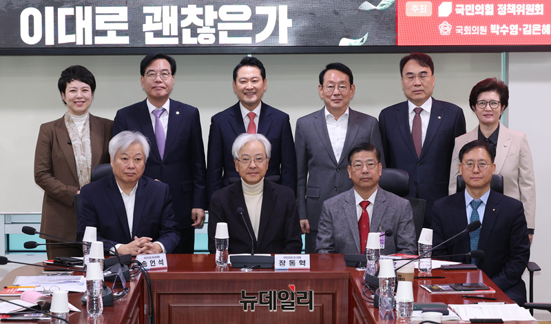 장동혁 국민의힘 대표, 송언석 원내대표, 김은혜 의원 등 참석자들이 20일 국회 의원회관에서 열린 '이재명 정부 예산 포퓰리즘 이대로 괜찮은가' 토론회에서 기념촬영을 하고 있다.