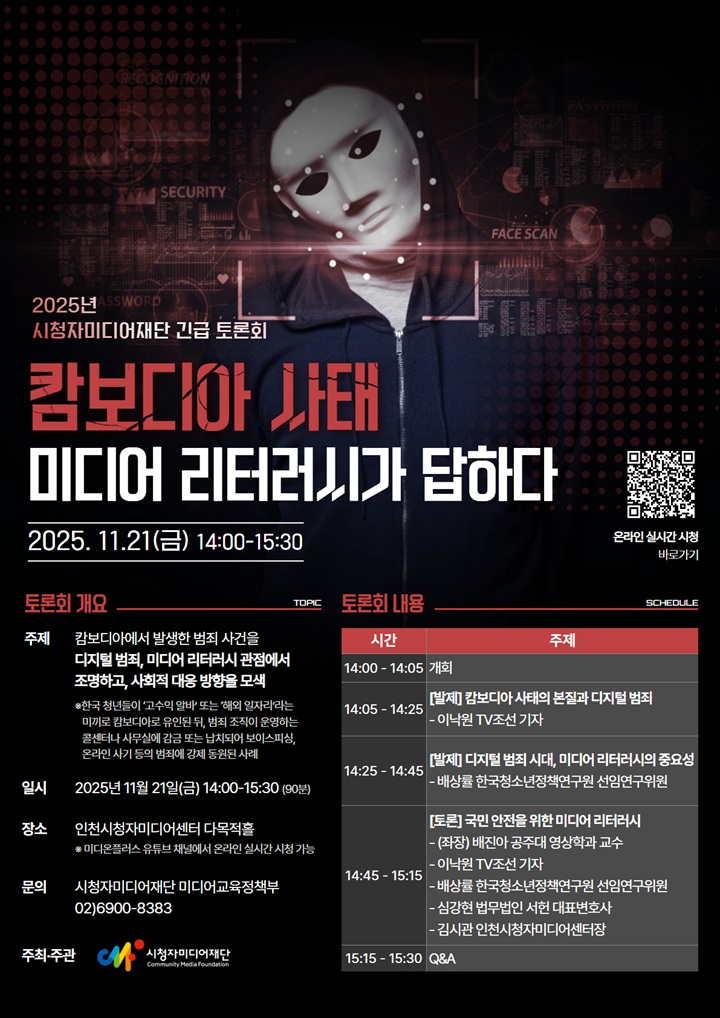 최철호 시청자미디어재단 이사장은 "캄보디아 사태는 단순한 해외 범죄 사건이 아니라, 디지털 미디어 환경과 미디어 리터러시 부재가 결합해 발생한 사회적 문제"라며 "이번 토론회를 통해 국민 안전을 위한 예방적 차원의 미디어 리터러시 교육에 대한 사회적 공감대를 확산시키겠다"고 밝혔다. 토론회는 미디온플러스 유튜브 채널(edu.kcmf.or.kr)을 통해서도 온라인 생중계된다.