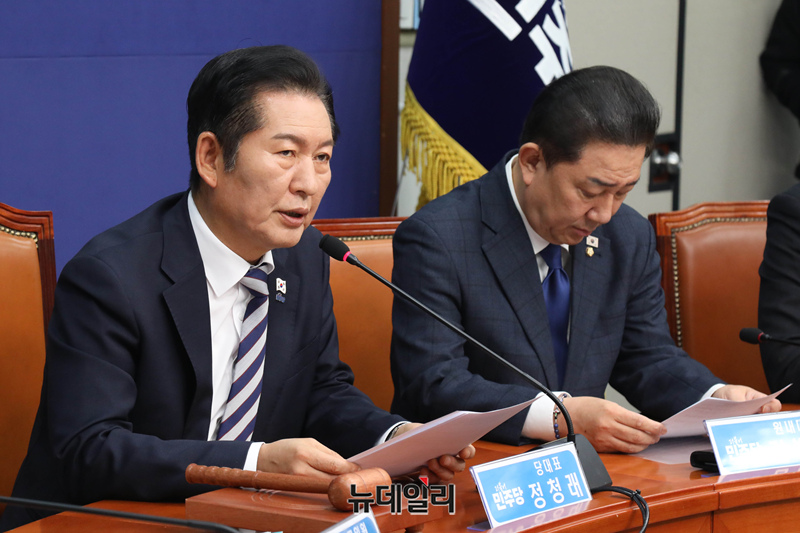 정청래 더불어민주당 대표가 21일 오전 국회에서 열린 최고위원회의에서 발언을 하고 있다.
