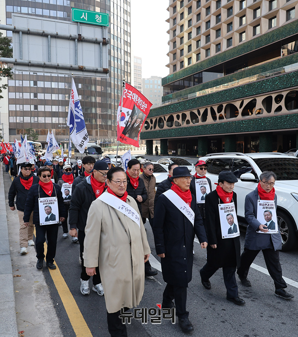 이승만과 함께 걷는 시민대행진 참가자들이 22일 오전 서울광장에서 출발해 숭례문 방향으로 행진을 하고 있다.