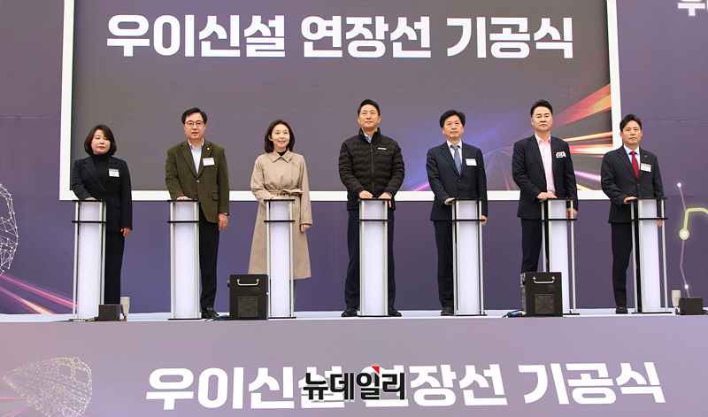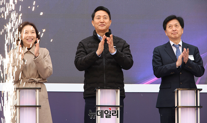 오세훈 서울시장, 최호정 서울시의장을 비롯한 참석자들이 24일 오전 서울 도봉구 방학사계광장에서 열린 우이신설 연장선 기공식에서 퍼포먼스를 하고 있다.
