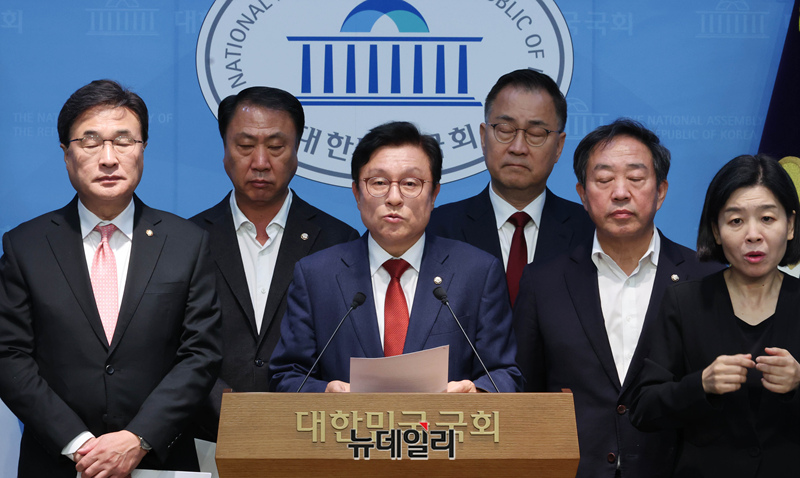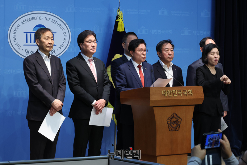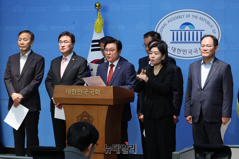 박형수 국회 예산결산특별위원회 국민의힘 간사와 의원들이 24일 오전 국회 소통관에서 열린 '2026년도 예산 국민의힘 민생 증액사업' 기자회견에서 발언을 하고 있다.