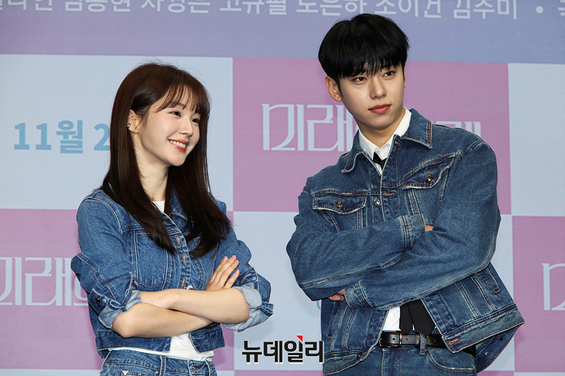 배우 권나연과 김동현이 24일 오후 서울 마포구 스탠포드 호텔에서 열린 U+ 모바일 tv 드라마 '미래의 미래' 제작발표회에서 포즈를 취하고 있다.