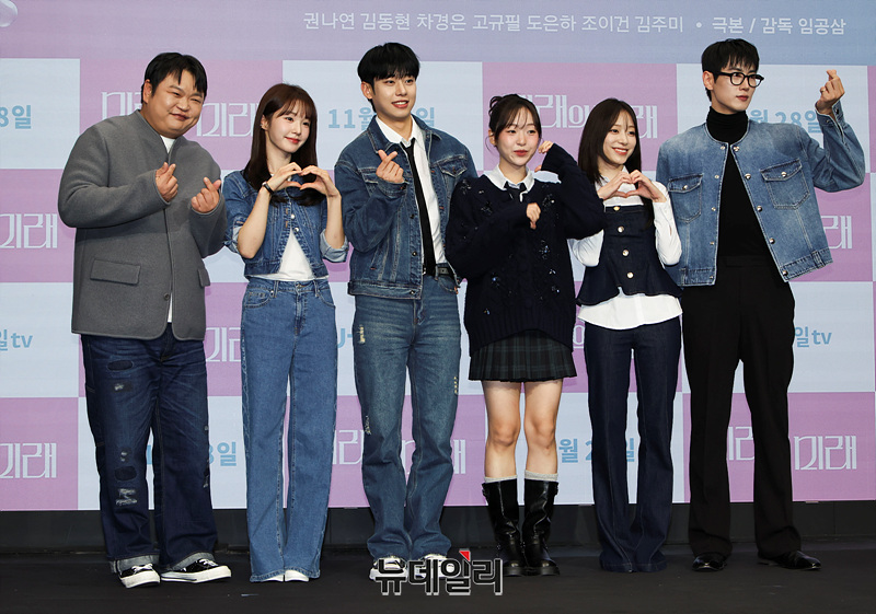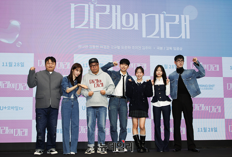 배우 권나연, 김동현, 차경은, 고규필, 조이건, 김주미가 24일 오후 서울 마포구 스탠포드 호텔에서 열린 U+ 모바일 tv 드라마 '미래의 미래' 제작발표회에서 포즈를 취하고 있다.