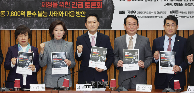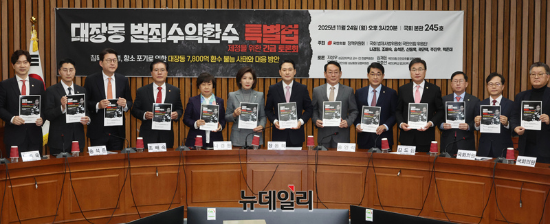 장동혁 국민의힘 대표와 정책위원회·법제사법위원회 소속 의원들이 24일 국회에서 열린 대장동 범죄수익환수 특별법 제정을 위한 긴급 토론회에서 기념 촬영을 하고 있다.