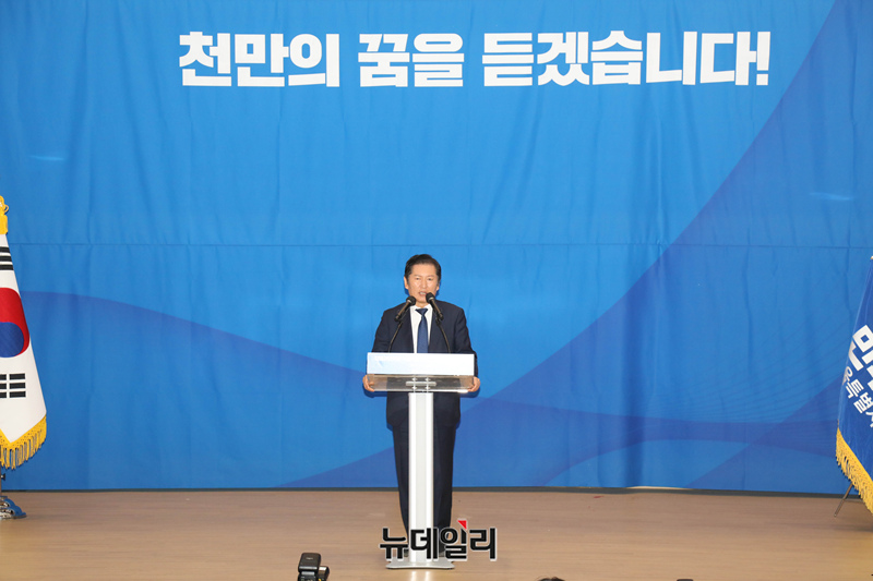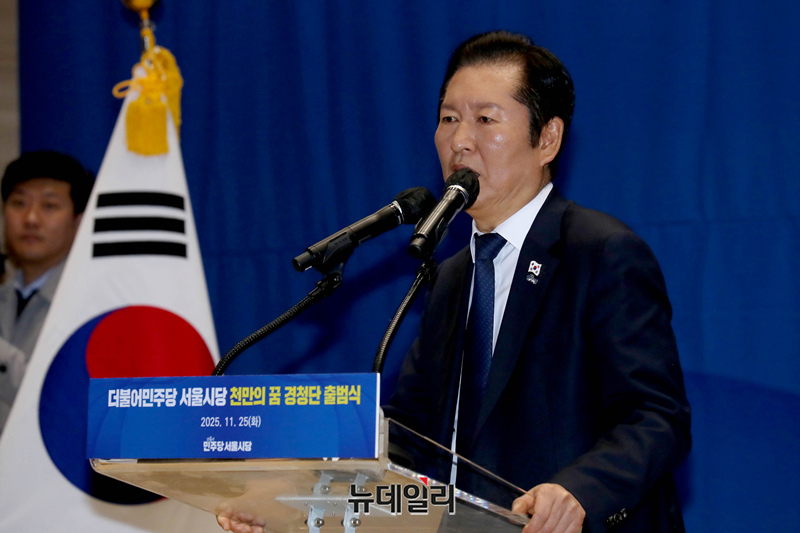정청래 더불어민주당 대표가 5일 오전 국회 의원회관에서 열린 '민주당 서울시당 천만의 꿈 경청단 출범식'에서 축사를 하고 있다.