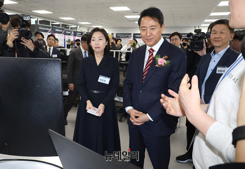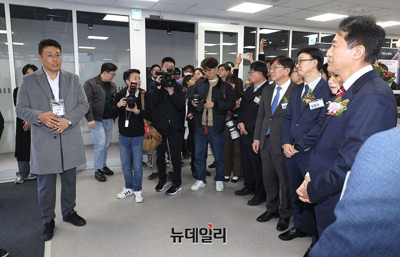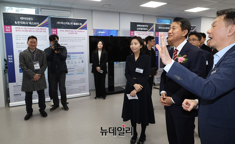 오세훈 서울시장, 최호정 서울시의회 의장 등이 25일 오후 서울 서초구 서울AI허브 메인센터에서 열린 '서울 산업 AX 혁신센터'와 '서울 AI 혁신협의회' 출범식에 앞서 장문석 센터장의 안내로 시설을 둘러보고 있다.이번 출범식에서 산업, 대학, 연구, 스타트업이 함께 참여하는 서울형 산업 AI 전환 생태계의 본격 가동을 선언했다.두 기관은 AI 기술도입-컨설팅-실증-확산까지 전 과정을 서울 안에서 처리할 수 있는 '완결형 실행 체계'를 구성해 산업 현장의 문제를 AI로 해결하는 실행 중심 플랫폼으로 기능하게 된다.