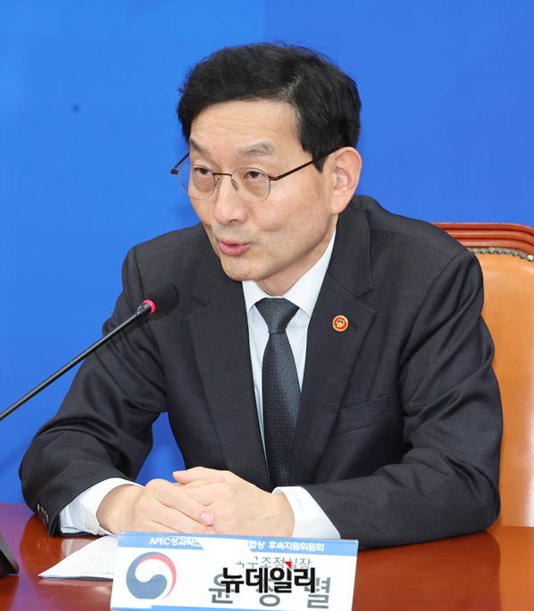 윤창렬 국무조정실장이 25일 오전 국회에서 열린 APEC 성과확산 및 한미관세협상 후속지원위원회 출범식에서 발언하고 있다.