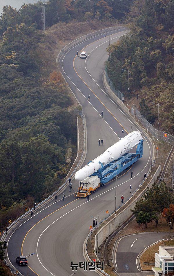 누리호 4차 발사를 앞둔 25일 오전 전남 고흥군 나로우주센터에서 누리호가 발사대로 이송되고 있다. (사진=한국항공우주연구원)