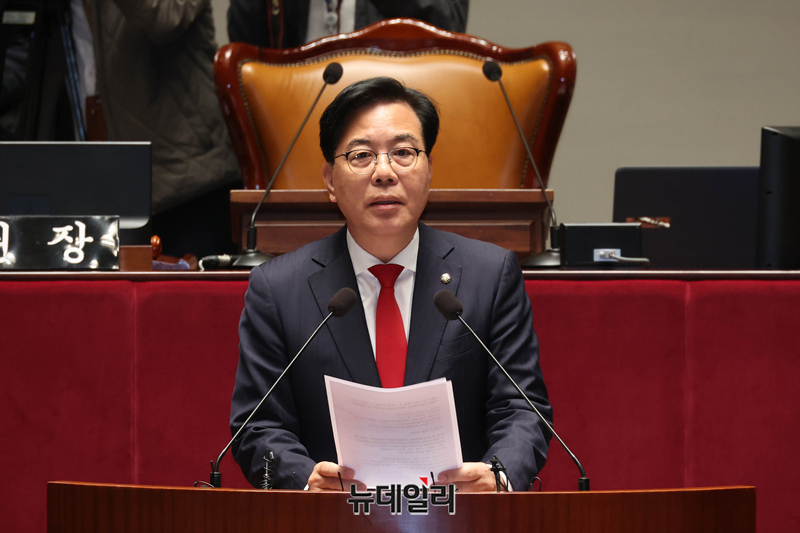 송언석 국민의힘 원내대표가 27일 오전 국회에서 열린 의원총회에서 모두발언을 하고 있다.