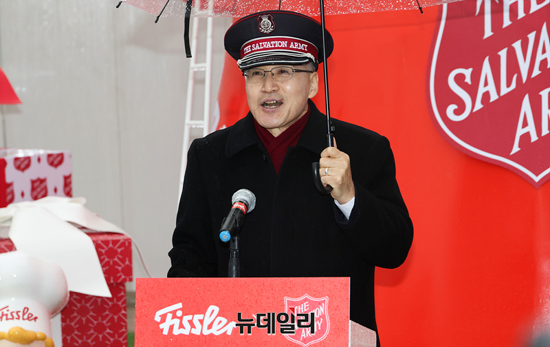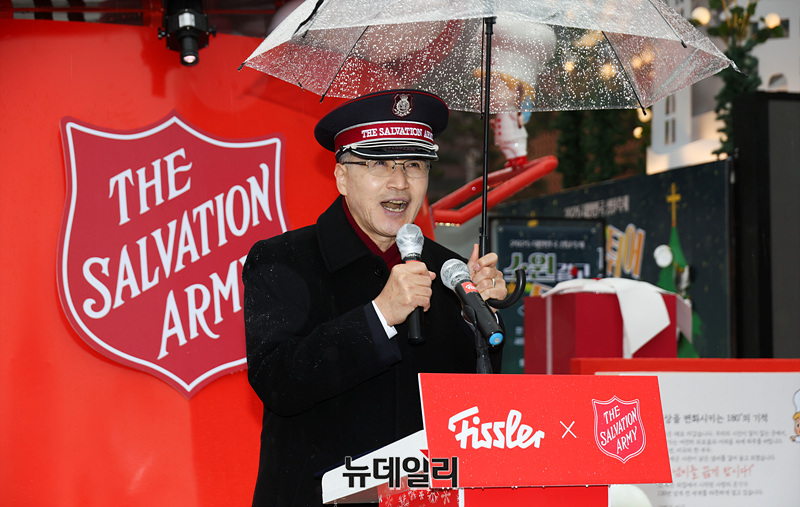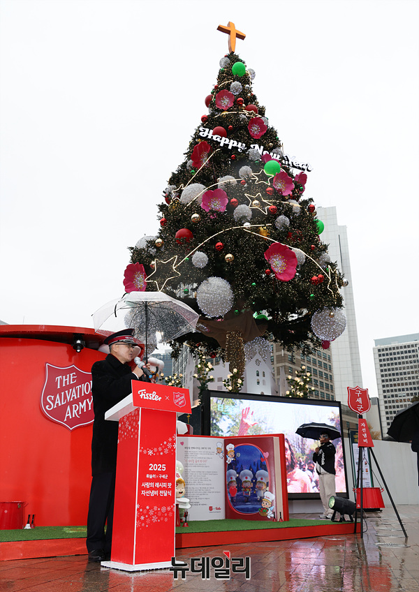김병윤 한국 구세군 사령관이 27일 오전 서울 중구 서울광장에서 열린 '2025 사랑의 레시피 팟 자선냄비 전달식'에서 인사말을 하고 있다.이번에 기증된 사랑의 레시피 팟 체험관은 1891년 미국의 한 부두에서 시작된 자선냄비의 기원처럼 '작은 온기가 세상을 변화시킨다'는 메시지에서 출발해 기획됐다. 시민의 참여로 따뜻함이 끓어오르는 순간을 상징하는 초대형 사랑의 레시피 팟, 요리 요정 조형물, 자선냄비의 유래를 담은 스토리북, 나눔 참여를 독려하는 체험형 포토존 등이 함께 구성됐다.시민 누구나 방문해 직접 기부에 참여하고 나눔의 의미를 체험할 수 있는 '사랑의 레시피 팟 체험관'은 이날 전달식을 시작으로 1월 중순까지 서울광장에서 운영된다.