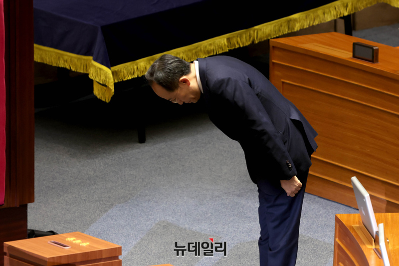 계엄 해제 의결 방해 혐의로 구속영장이 청구된 추경호 국민의힘 의원이 27일 오후 국회 본회의에서 자신의 체포동의안 표결에 앞서 신상발언을 마친 후 회의장을 떠나고 있다.