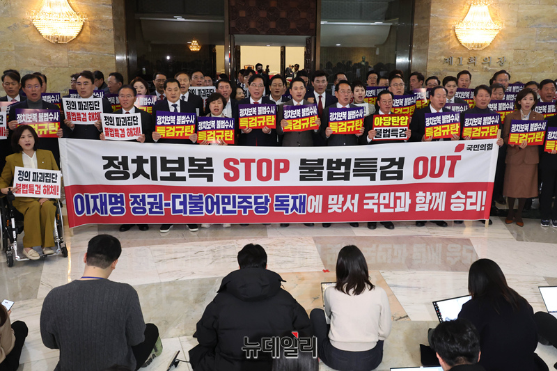 장동혁 국민의힘 대표와 송언석 원내대표 등 의원들이 27일 오후 국회 본회의장 앞에서 특검 규탄대회를 열고 구호를 외치고 .