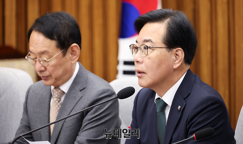 송언석 국민의힘 원내대표가 28일 오전 국회에서 열린 원내대책회의에서 모두발언을 하고 있다.
