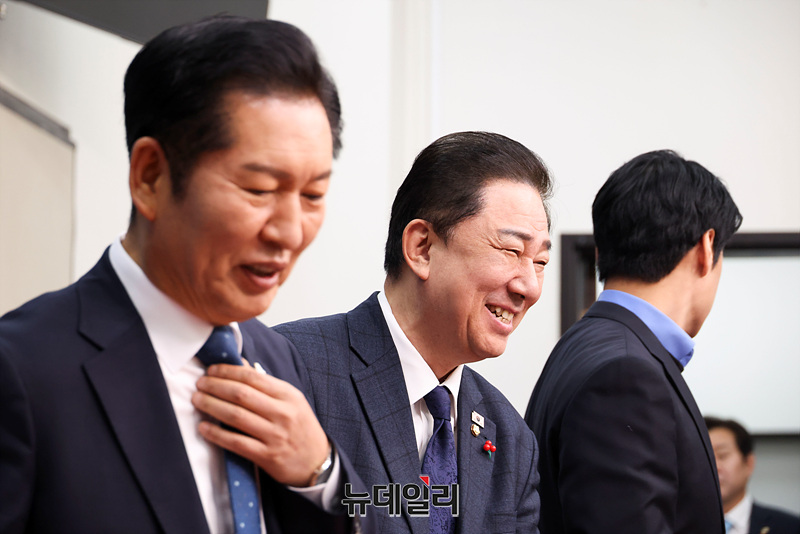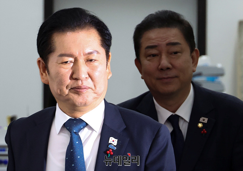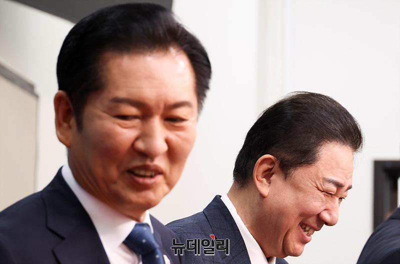 정청래 더불어민주당 대표와 김병기 원내대표가 28일 오전 국회에서 열린 최고위원회의에 참석하고 있다.