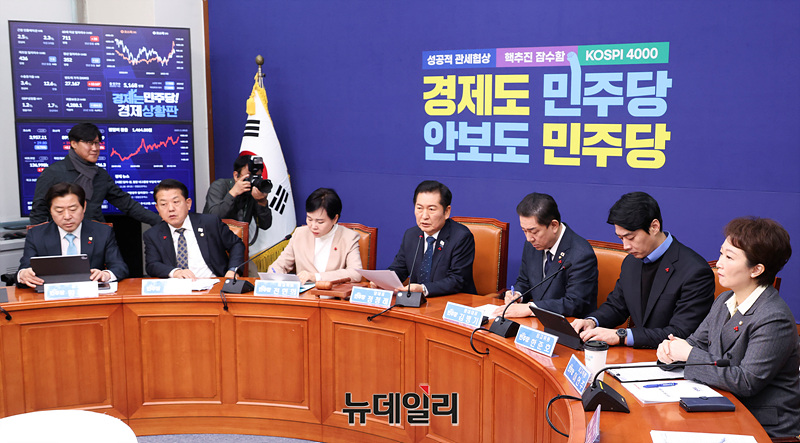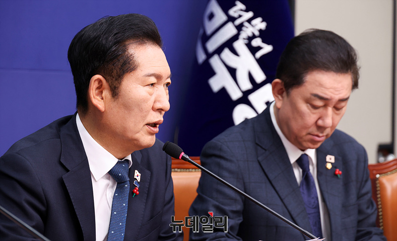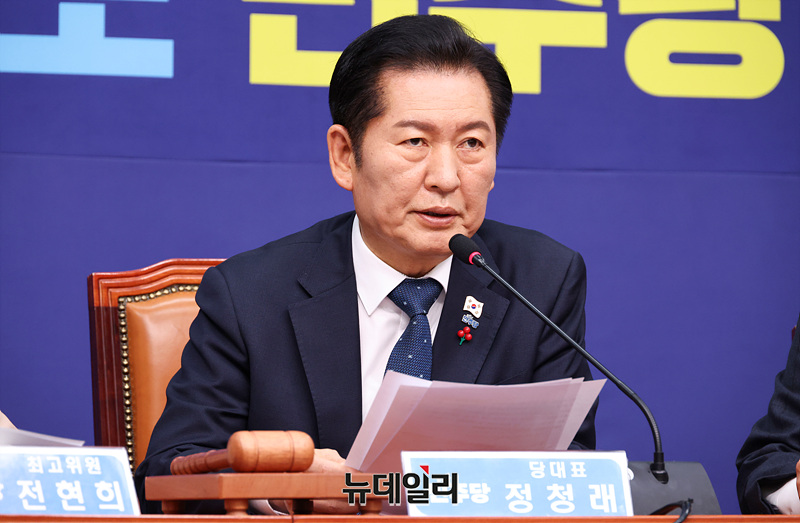 정청래 더불어민주당 대표가 28일 오전 국회에서 열린 최고위원회의에서 모두발언을 하고 있다.