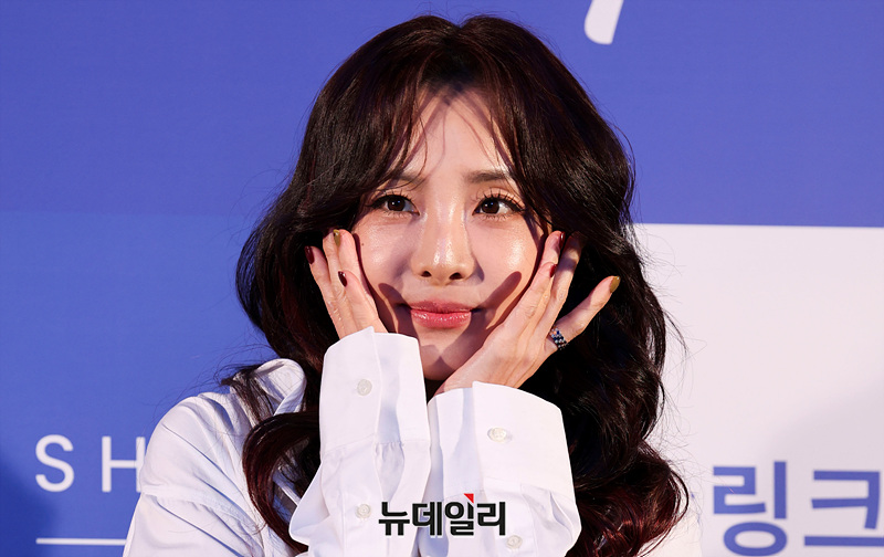 가수 산다라박이 28일 오후 서울 성동구 XYZ SEOUL에서 열린 홈케어 리프팅 디바이스 '슈링크홈 리프투글로우' 출시 기념 포토월에서 포즈를 취하고 있다.