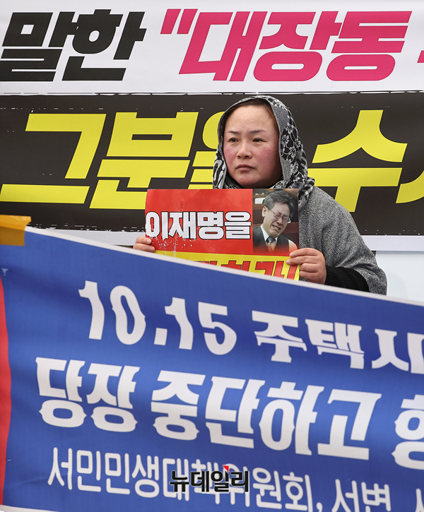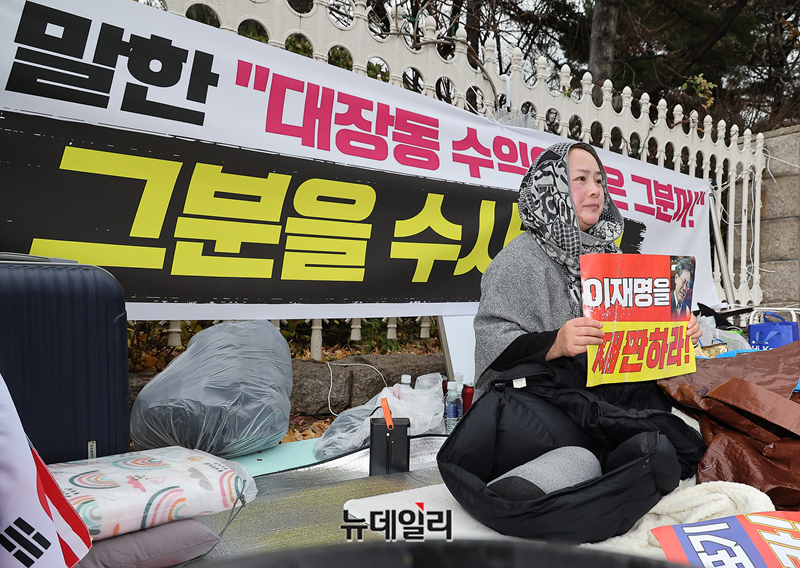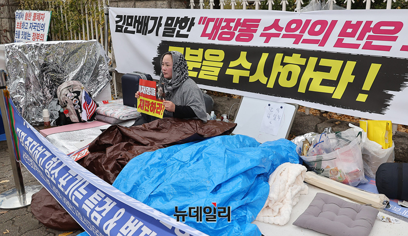 보건학문&인권연구소 김문희 대표가 단식 나흘째인 29일 오후 서울 여의도 국회의사당 정문앞에서 검찰의 대장동 사건 항소 포기를 규탄하며 단식농성을 이어가고 있다. 김 대표는 대장동 범죄 수익 환수와 중지된 이재명 관련 재판 재개를 요구하며 26일 부터 단식을 이어가고 있다.
