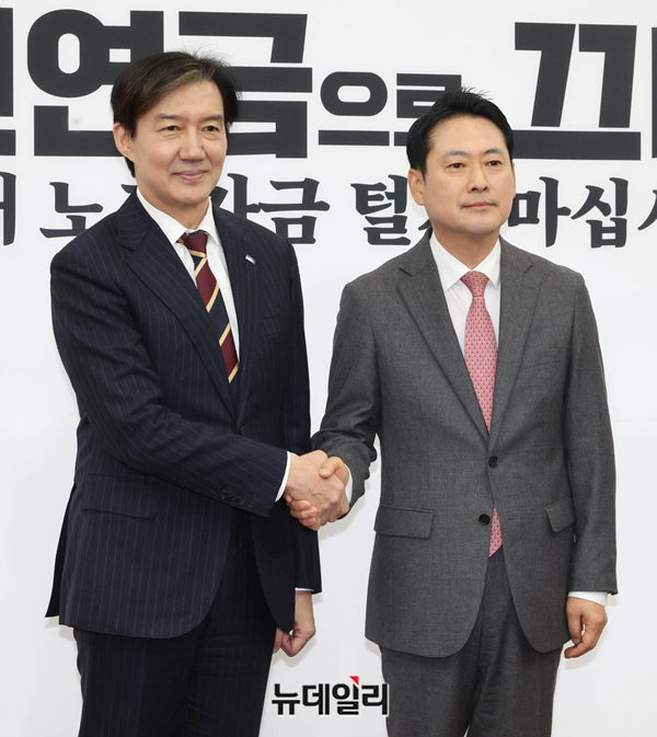 장동혁 국민의힘 대표와 조국 조국혁신당 대표가 1일 오전 국회에서 만나 기념촬영하고 있다.