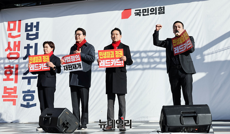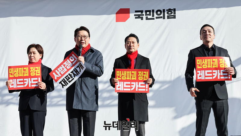 장동혁 국민의힘 대표, 양향자, 신동욱, 김민수 최고위원이 1일 오후 인천 주안역 앞에서 열린 민생회복 법치수호 인천 국민대회에서 인사하고 있다. (인천=서성진 기자)