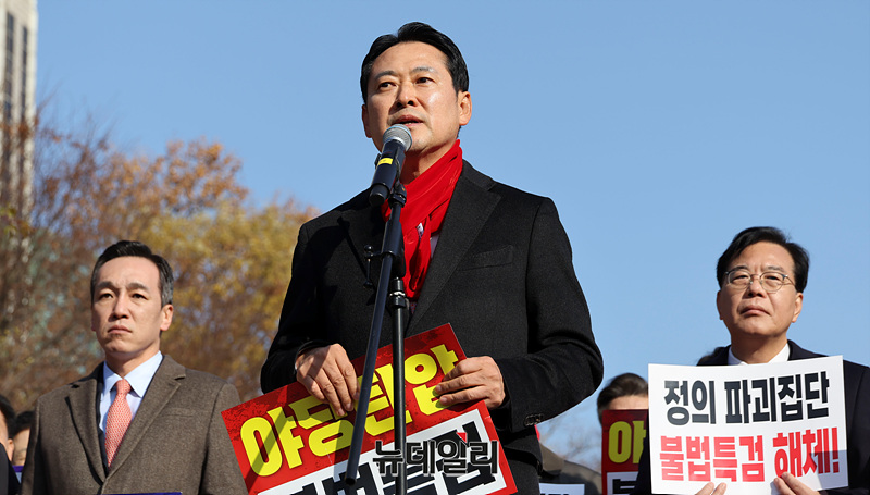 장동혁 국민의힘 대표가 2일 오후 서울 서초구 서울중앙지법 앞에서 열린 추경호 의원 구속 심사 규탄대회에서 발언하고 있다.