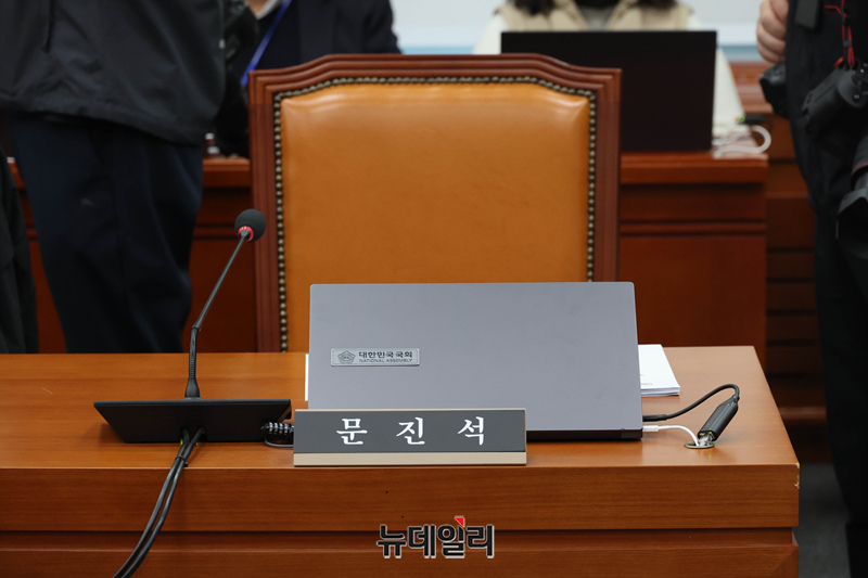 국회 운영위원회 전체회의가 3일 국회에서 열린 가운데, 문진석 더불어민주당 의원의 자리가 비어 있다.
