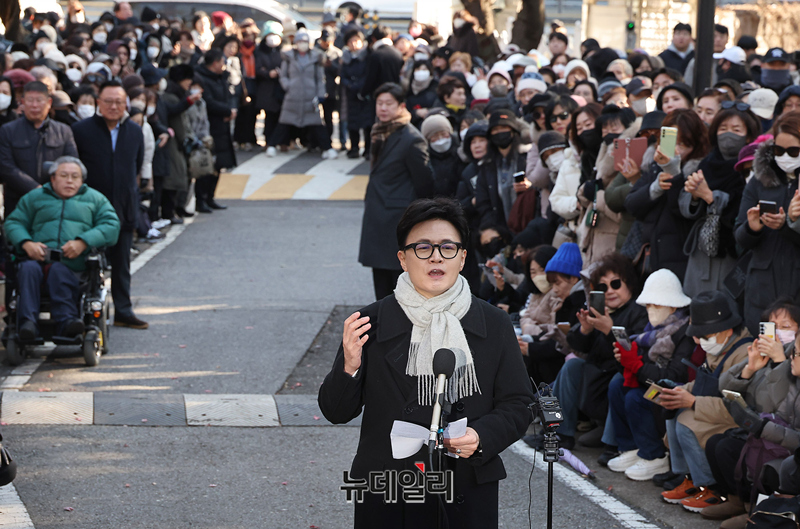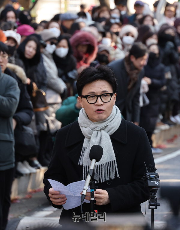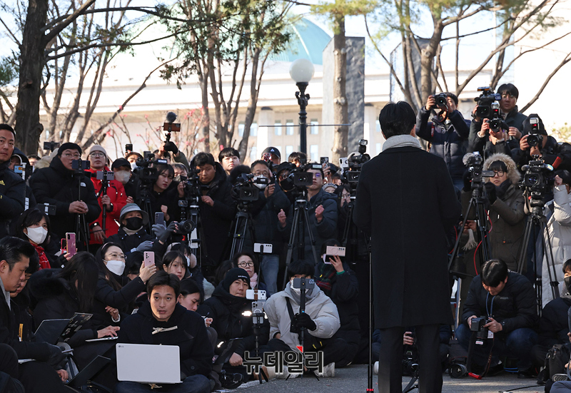 한동훈 전 국민의힘 대표가 3일 오후 국회도서관 입구에서 열린 12.3 비상계엄 1주년 관련 기자회견에서 입장을 밝히고 있다.