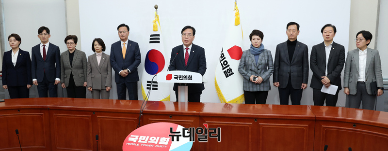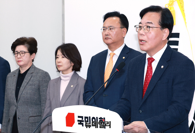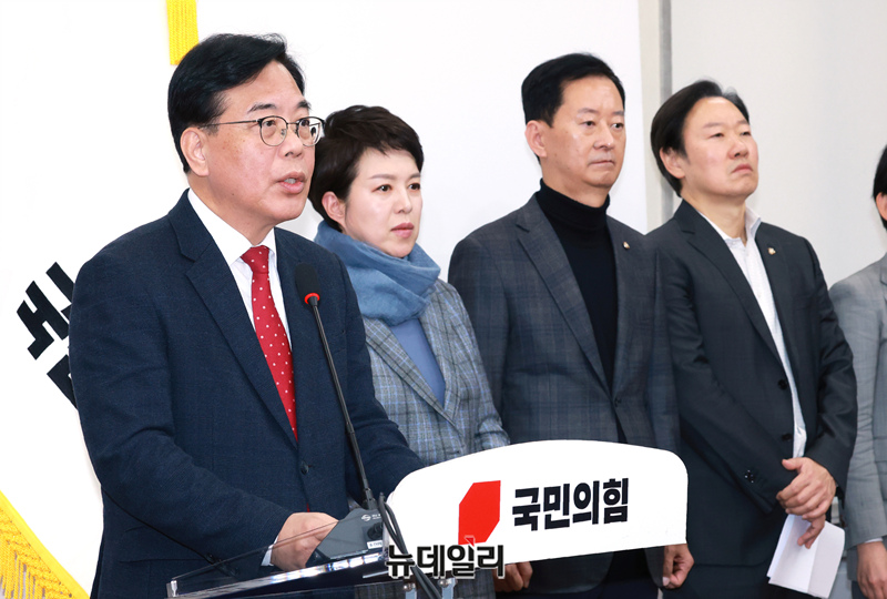 송언석 국민의힘 원내대표가 3일 오전 국회에서 지난 12·3 비상계엄 사태를 막지 못한 책임에 대한 사과 기자회견을 갖고 있다.