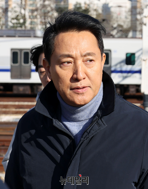 오세훈 서울시장이 3일 오후 서울 노원구 창동차량기지에서 열린 '진접차량기지 시험운행 개시 기념행사'에 참석하고 있다.