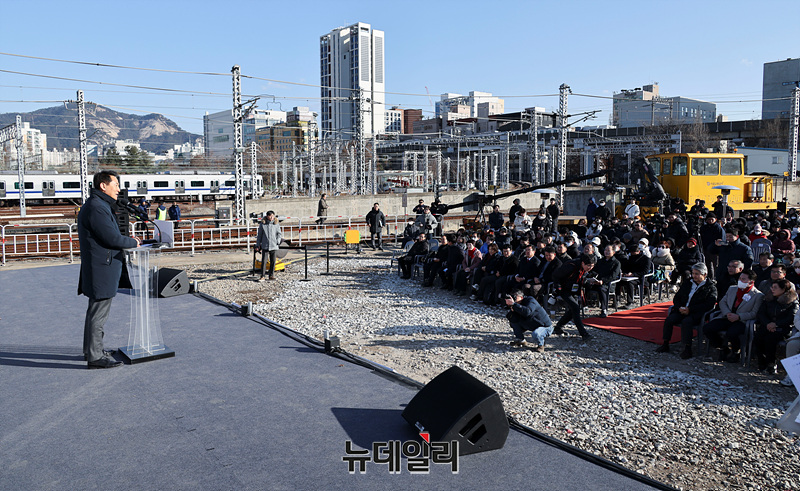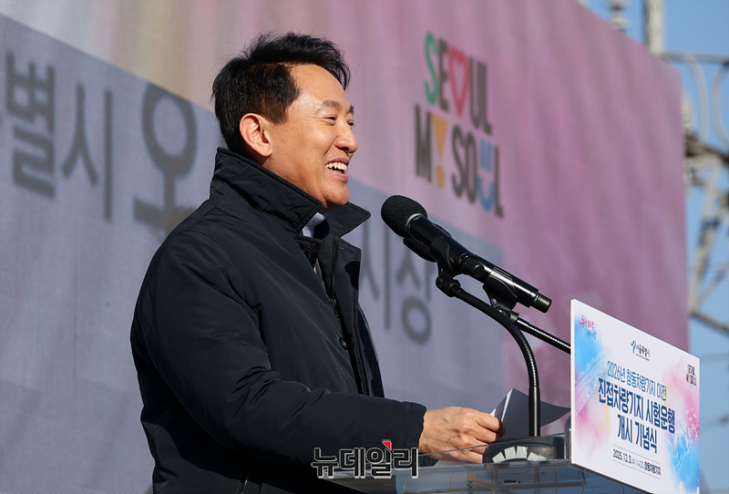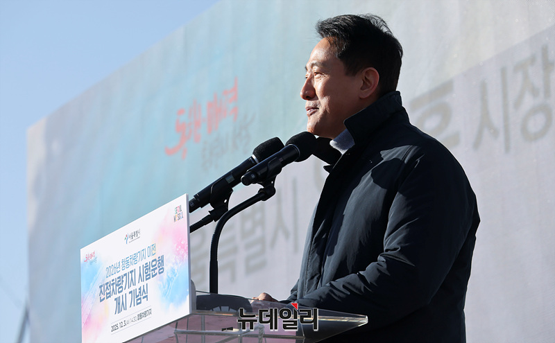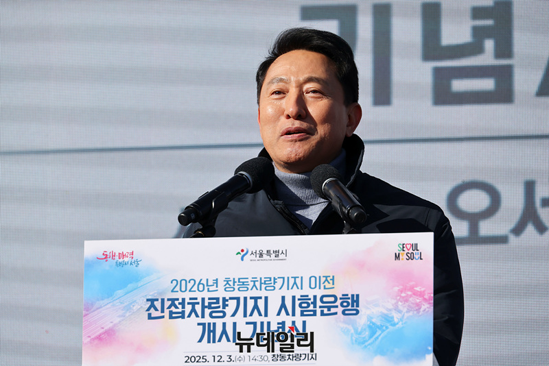 오세훈 서울시장이 3일 오후 서울 노원구 창동차량기지에서 열린 '진접차량기지 시험운행 개시 기념행사'에서 기념사를 하고 있다.