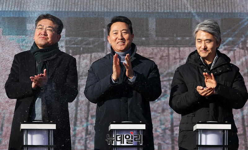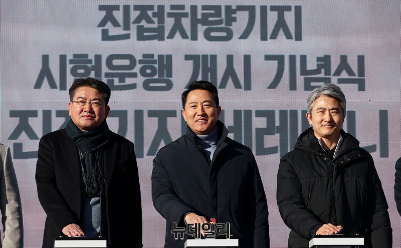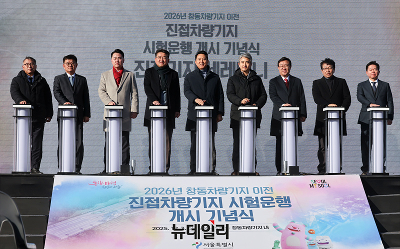 오세훈 서울시장을 비롯한 참석자들이 3일 오후 서울 노원구 창동차량기지에서 열린 '진접차량기지 시험운행 개시 기념행사'에서 기념촬영을 하고 있다.