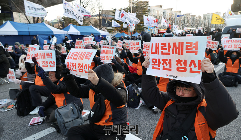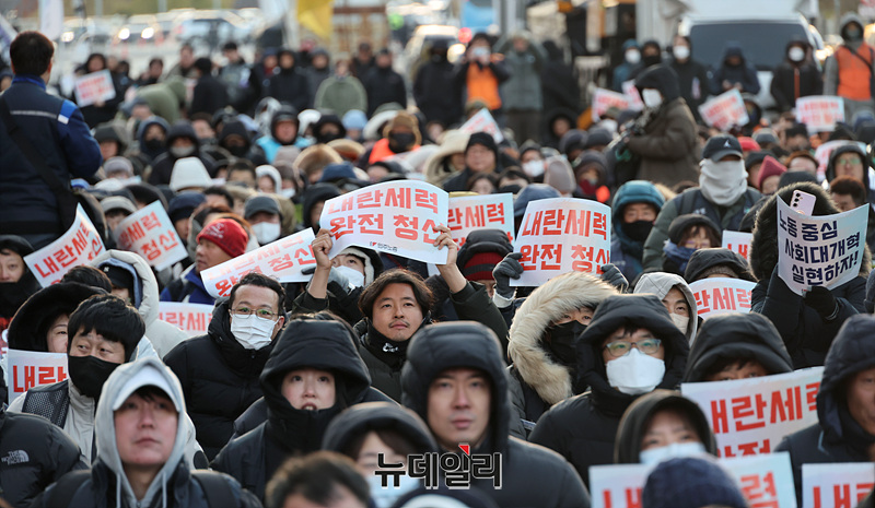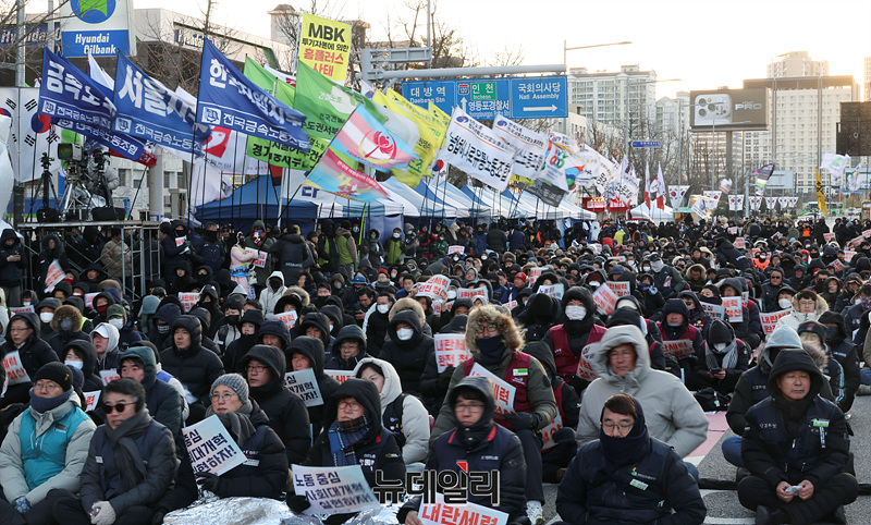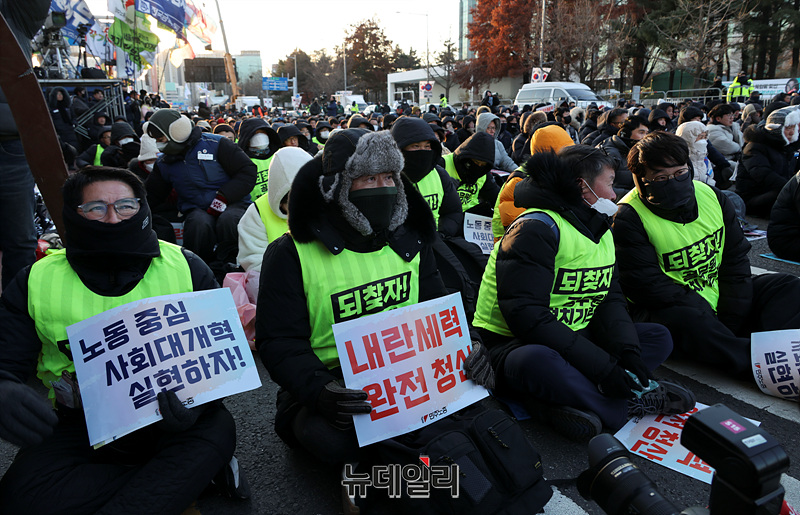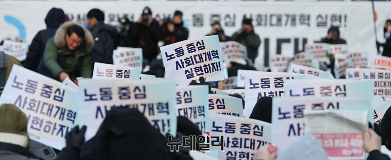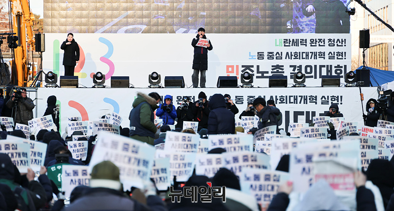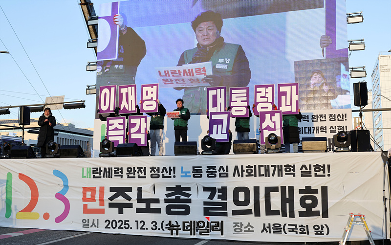 민노총 집회 참석자들이 3일 오후 서울 여의도 국회 앞에서 열린 '내란세력 완전 청산·노동 중심 사회 대개혁 실현 결의대회'에서 피켓을 들고 구호를 외치고 있다.