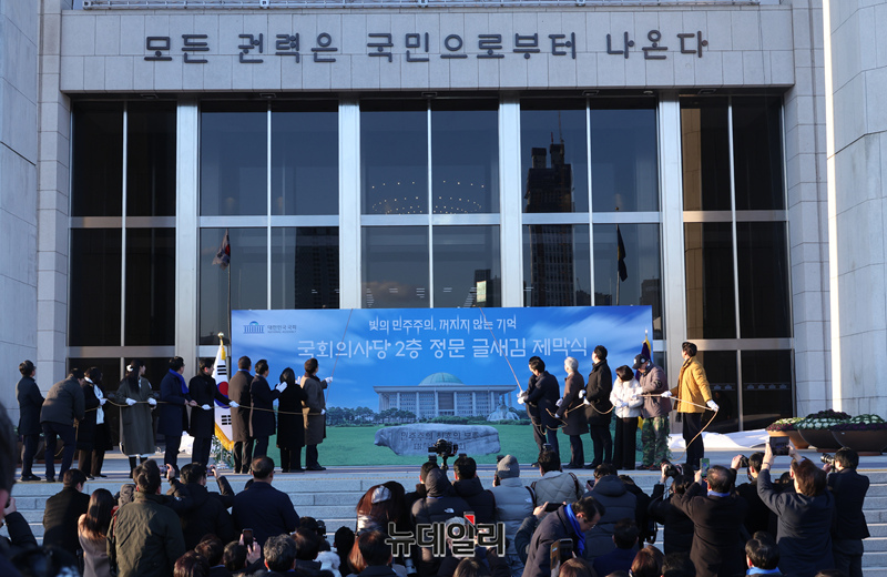 우원식 국회의장이 3일 오후 국회에서 열린 정현관 글새김 제막식에서 참석 내빈들과 제막을 하고 있다.