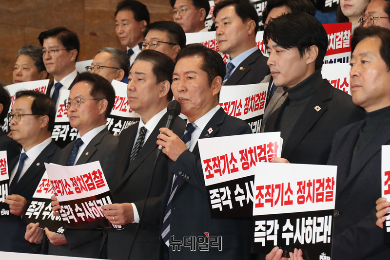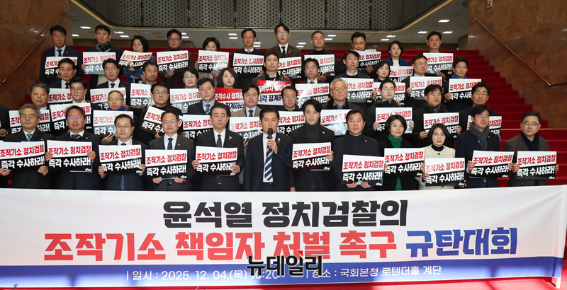 정청래 더불어민주당 대표가 4일 국회에서 열린 윤석열 정치검찰의 조작기소 책임자 처벌 촉구 규탄대회에서 발언하고 있다.