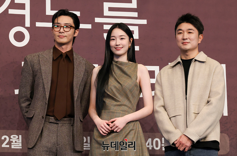 배우 박서준, 원지안, 임현욱 감독이 4일 오후 서울 구로구 더링크 호텔에서 열린 JTBC 새 토일드라마 경도를 기다리며 제작발표회에서 포즈를 취하고 있다.