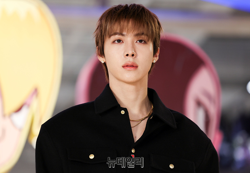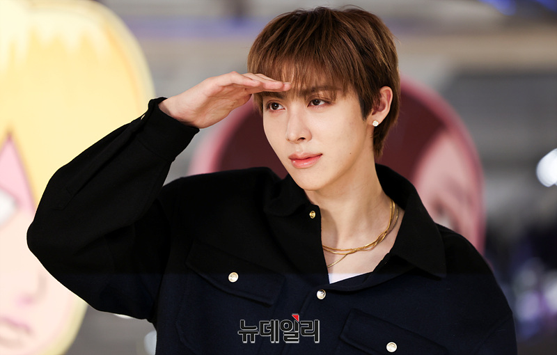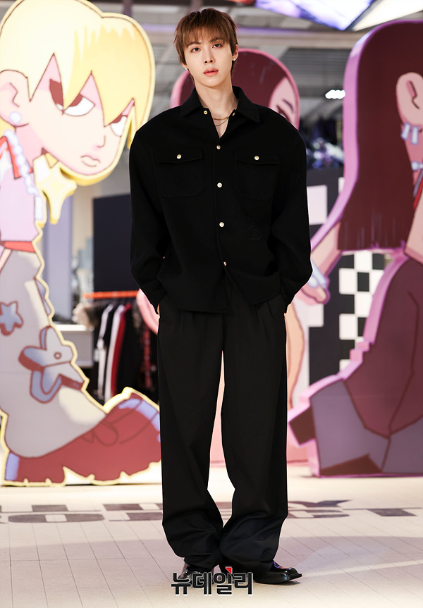 혼성그룹 올데이프로젝트 우찬이 8일 오전 서울 성동구 에스팩토리에서 열린 첫 EP 타이틀곡 '룩앳미(LOOK AT ME)' 팝업스토어 오픈 기념 행사에서 포즈를 취하고 있다.