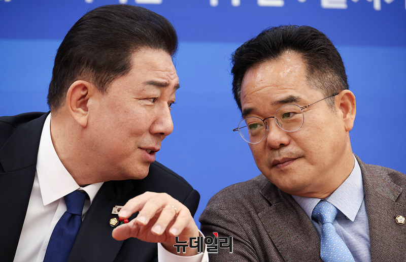 김병기 더불어민주당 원내대표와 민병덕 민주당 을지로위원장이 9일 오전 국회에서 열린 대·중소기업 기술 분쟁 해결을 위한 상생협약식에서 대화를 나누고 있다.