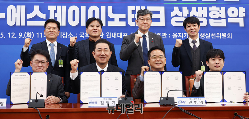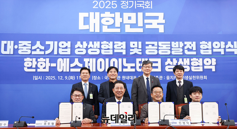 김병기 더불어민주당 원내대표, 민병덕 을지로위원장, 류두형 한화 대표이사, 정성호 SJ 이노테크 대표이사를 비롯한 참석자들이 9일 오전 국회에서 열린 대·중소기업 기술 분쟁 해결을 위한 상생협약식에서 기념촬영을 하고 있다.