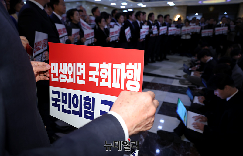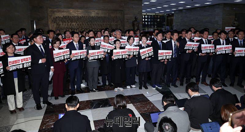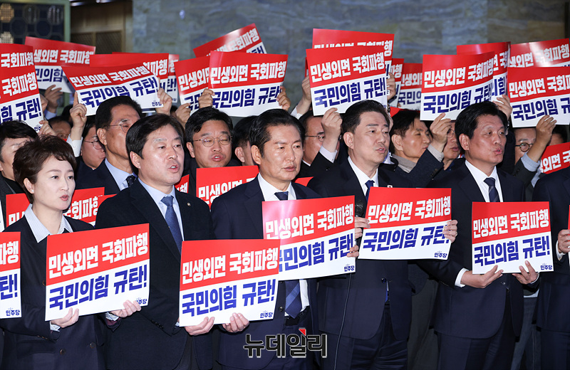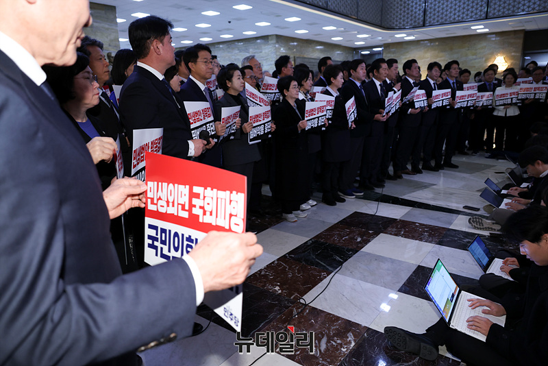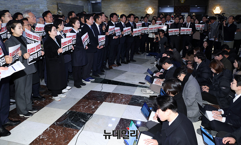 더불어민주당 의원들이 9일 오후 서울 여의도 국회 로텐더홀에서 국민의힘을 규탄하고 있다.