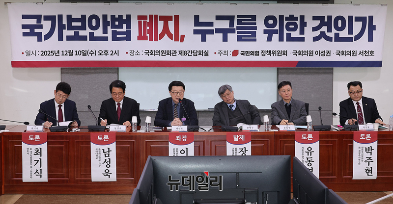 이인호 중앙대 법학전문대학원 교수가 10일 오후 국회의원회관에서 열린 '국가보안법 폐지, 누구를 위한 것인가' 토론회에서 좌장을 맡아 주재하고 있다.이날 토론회는 국민의힘 정책위원회 이성권, 서천호 국회의원의 주최로 이인호 중앙대 교수가 좌장을 맡았다. 발제는 '국가보안법 폐지 법률안의 헌법적 문제점'을 주제로 장영수 고려대 명예교수가 맡았다.어어진 토론에는 남성욱 고려대 교수, 유동열 자유민주연구원장, 박주현 전 경찰수사연구원 안보수사학과장, 최기식 변호사가 나섰다.