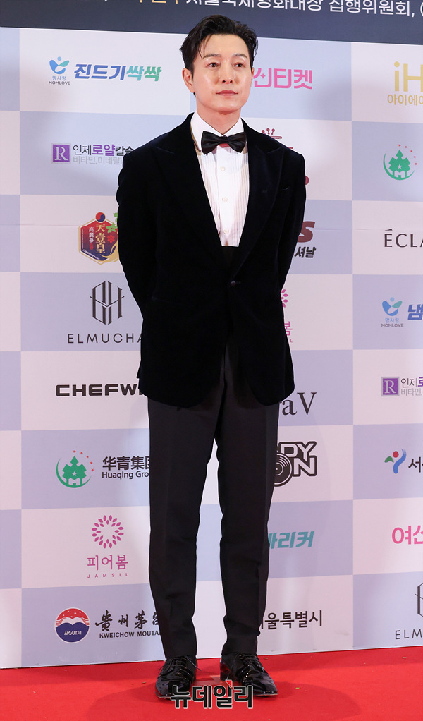 배우 정성일이 10일 오후 서울 용산구 드래곤시티에서 열린 '2025 서울국제영화대상' 레드카펫 행사에서 포즈를 취하고 있다.