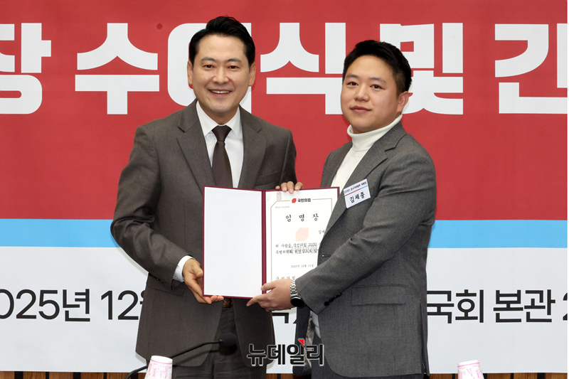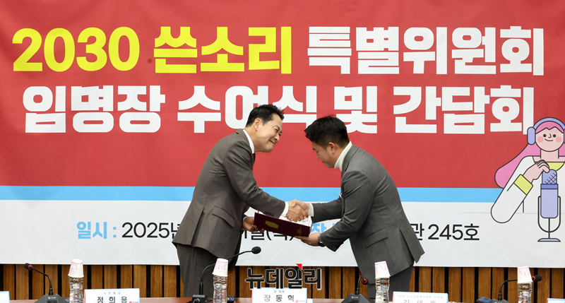 장동혁 국민의힘 대표가 11일 오전 국회에서 열린 '2030 쓴소리특별위원회 임명장 수여식'에서 김세종 위원장에게 임명장을 전달하고 있다.