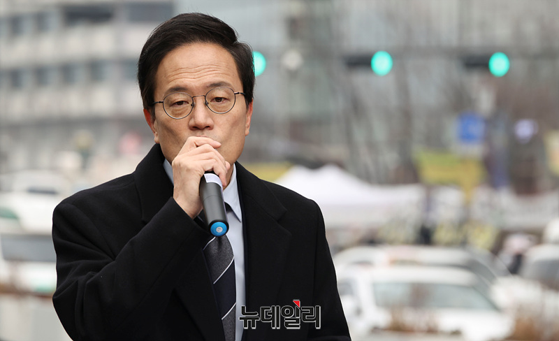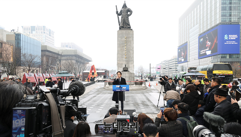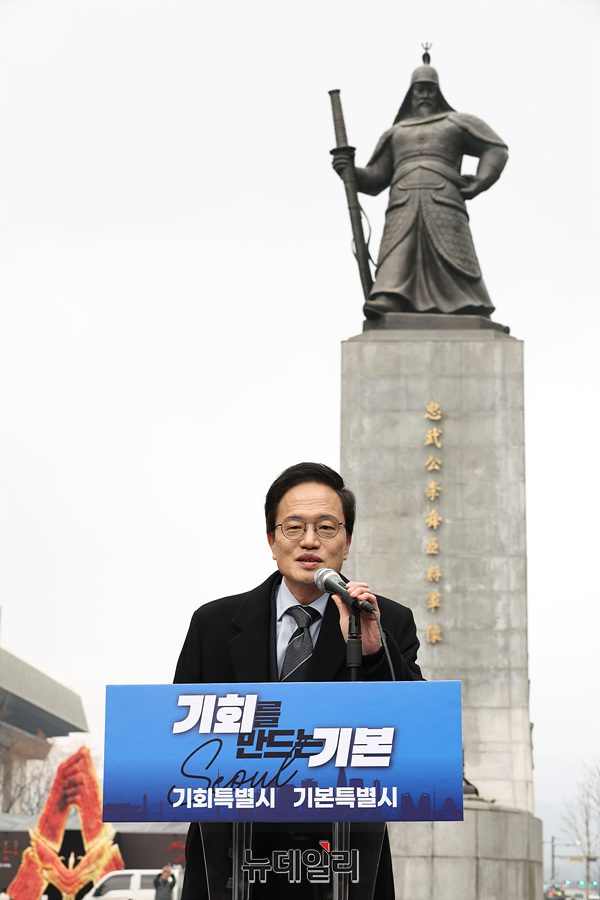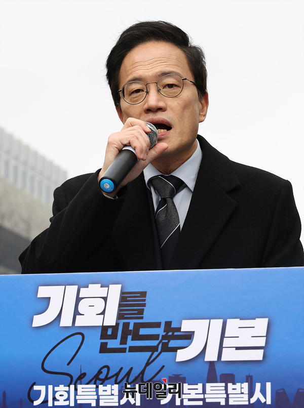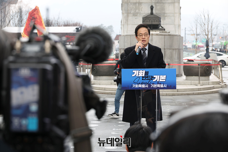 박주민 더불어민주당 의원이 11일 오전 서울 중구 광화문 광장에서 서울시장 출마 선언을 하고 있다.